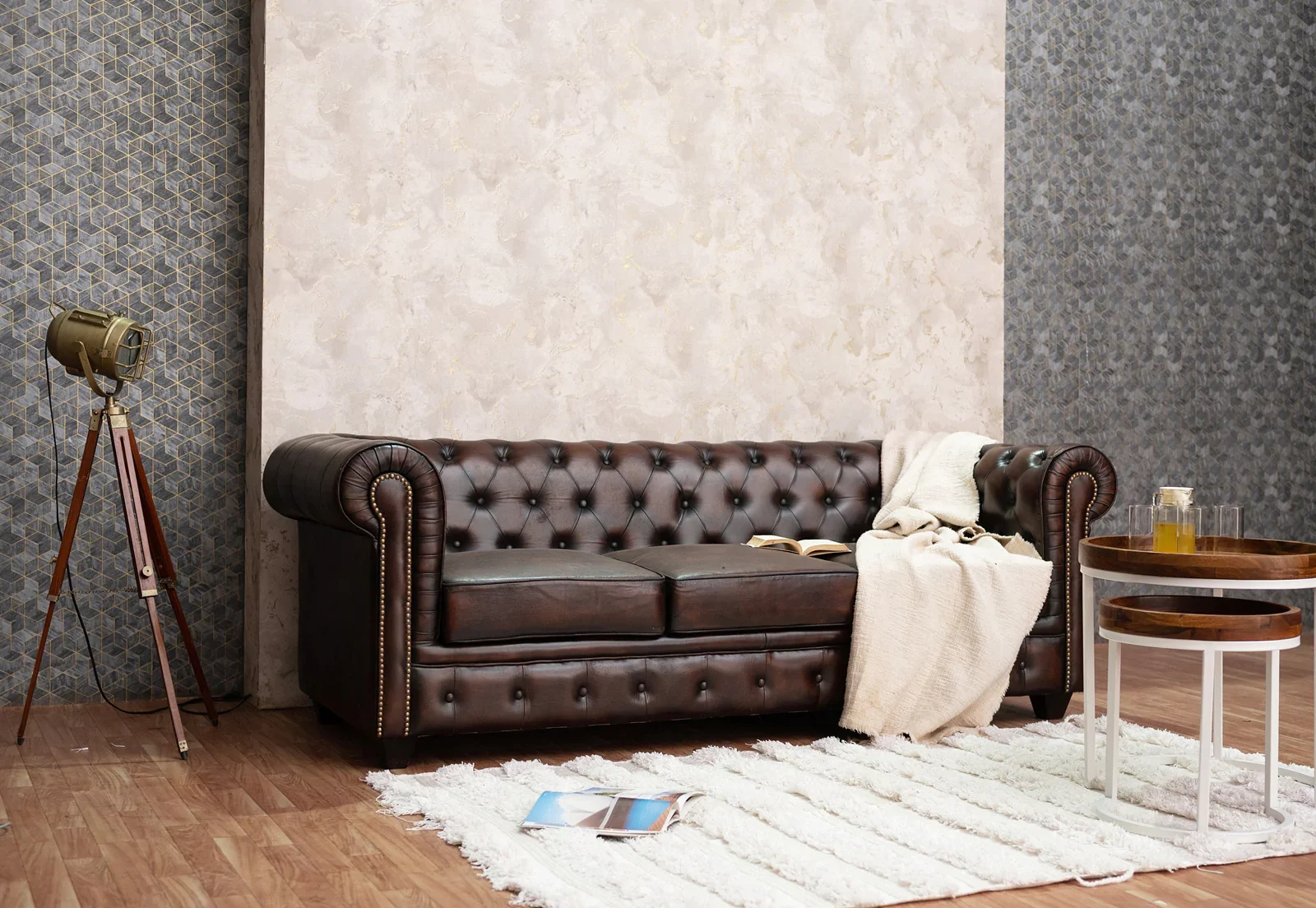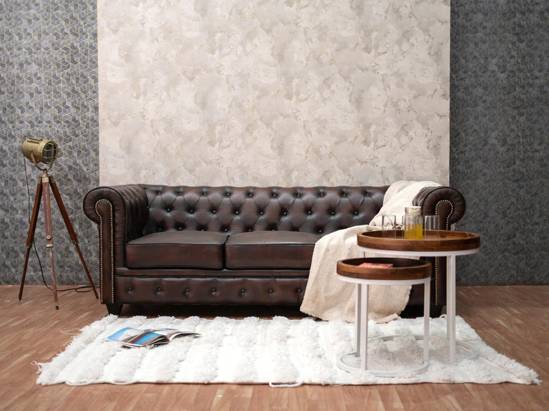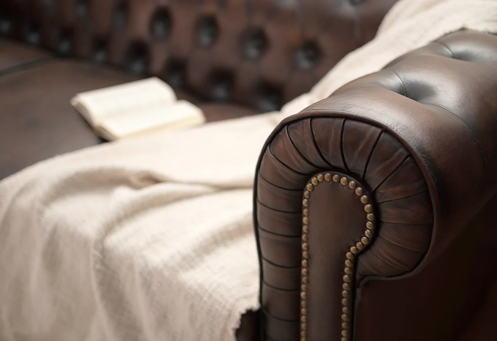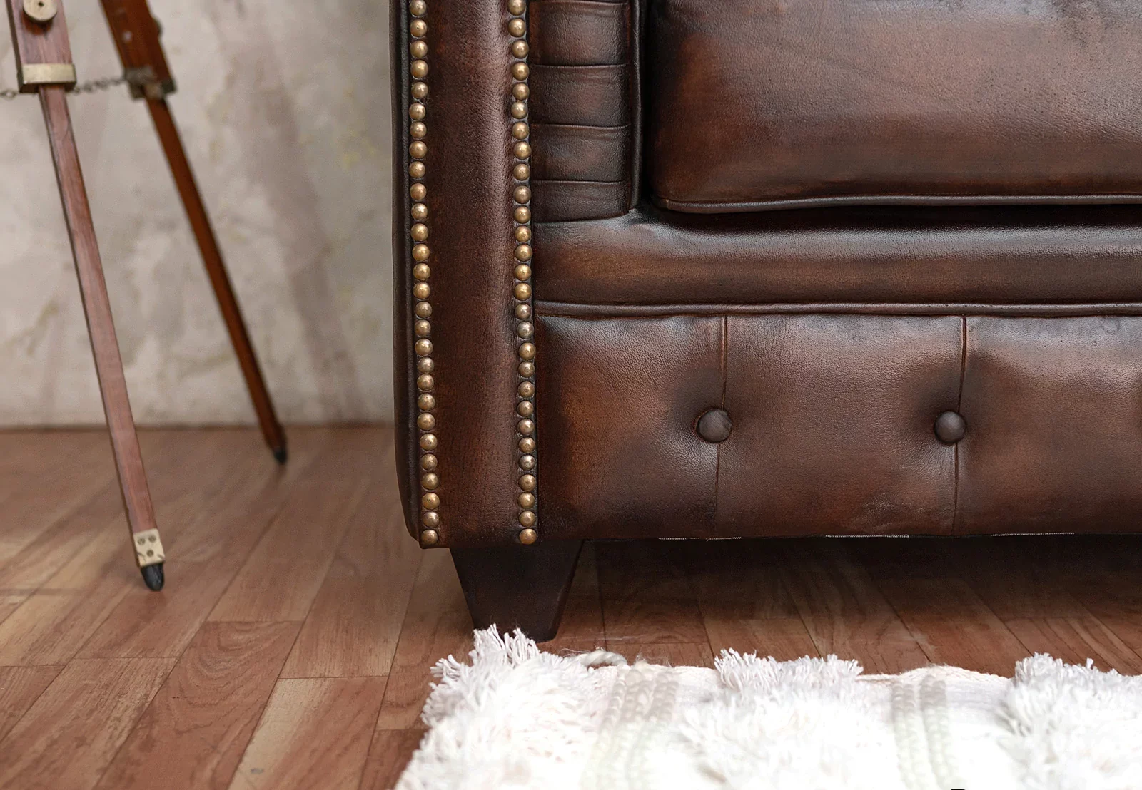 Crafted from 100% genuine leather, this sofa embodies richness and durability. Its deep button-tufted backrest, rolled arms, and antique-style nailhead accents reflect the traditional Chesterfield style admired worldwide. The natural vintage brown finish gives the piece a sophisticated, lived-in appeal, ensuring it blends seamlessly with both contemporary and classic spaces.
